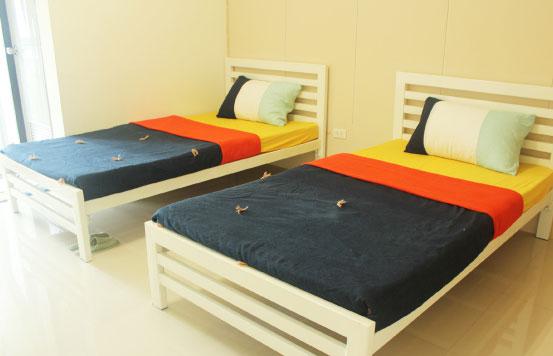 ถ้าต้องการห้องพักที่มี 2 เตียง มีห้องแบบไหนบ้าง ?| A: | ห้องพักที่มีเตียงเดี่ยว 2 เตียง จะมี 2 แบบค่ะ คือ ห้อง S มีเตียง 3 ฟุต 2 เตียง และ ห้อง CO มีเตียง 3.5 ฟุต 2 เตียงค่ะ |